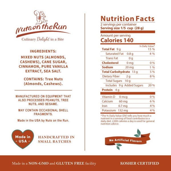 Nuts on the Run's Cinnamon Vanilla Glazed Nuts are delicately roasted with almonds, cashews, cinnamon, pure vanilla extract, and organic cane sugar. Simple ingredients, simply tasty.