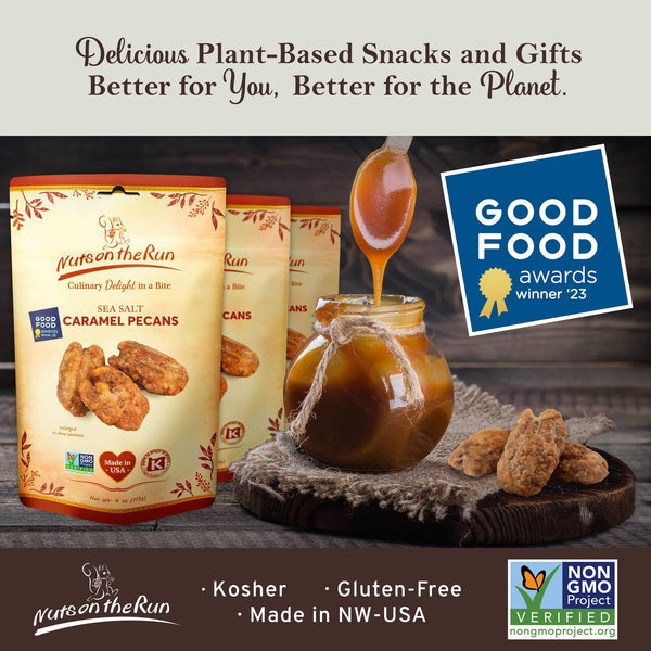 Nuts on the Run's Sea Salt Caramel pecan is a 2023 Good Food Award winner for taste, Texture and great ingredients! Made with a rich caramel blend that consists of organic coconut cream and organic cane sugar, pecans, and a dash of flaky sea salt. Roasted over low heat in small batches to ensure freshness and crafted with the utmost respect to quality ingredients, our nuts are as fresh and tasty as can be!