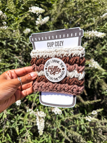 Keep your hands warm (or free from condensation if you’re enjoying a cold drink) this season with our “First I drink the Coffee then I do the Things Cup Cozy” Cozy.