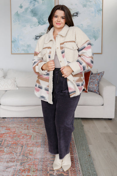 Stay cozy and stylish in our Sedona Sunset Shacket. This must-have item features a sherpa fleece panel, classic brushed Aztec patterned woven fabric, and side pockets. Button front closure keeps you snug in the mid to heavy-weight fabric, while the pockets provide convenience. Make a statement with our Sedona Sunset Shacket!