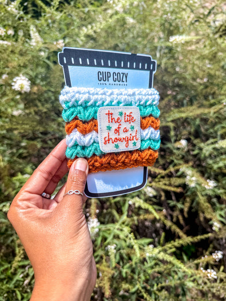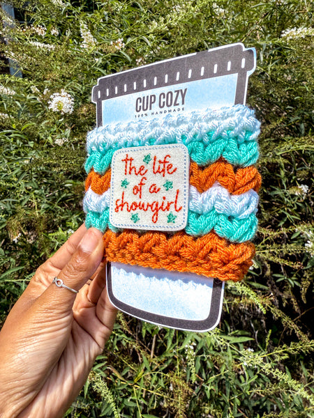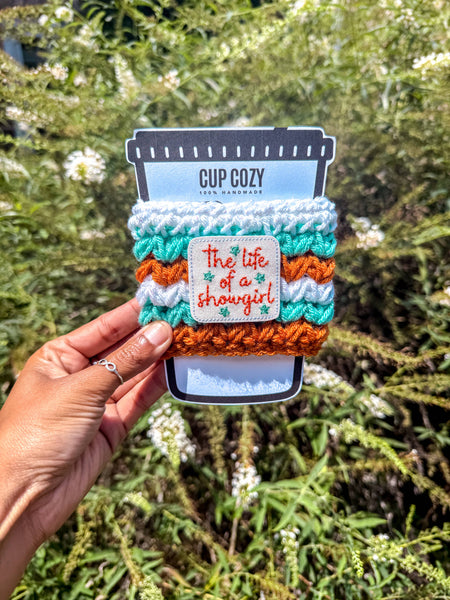 Keep your hands warm (or free from condensation if you’re enjoying a cold drink) this season with our “The Life of a Showgirl” Cozy.